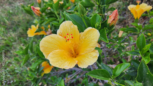 © cilicia, Fototapeta premium This stunning yellow Hibiscus (Hibiscus rosa-sinensis) is just as beautiful as its famous red counterpart. Its vibrant hue adds magnificent charm, proving nature's diverse beauty.