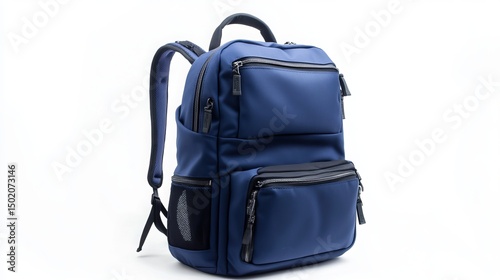 © Aynur, Naklejka premium This stylish navy backpack boasts ample storage with multiple compartments, a front zipper pocket, and mesh side pockets. Perfect for daily use and any occasion.