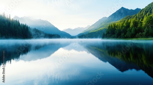 Naklejka premium This tranquil lake scene captures the majestic mountains reflecting beautifully in the calm water, with a soft mist highlighting the serene ambiance of untouched nature.