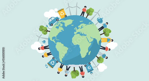 Fototapeta premium This vector image depicts a diverse group of people standing around the Earth, representing global efforts for sustainability