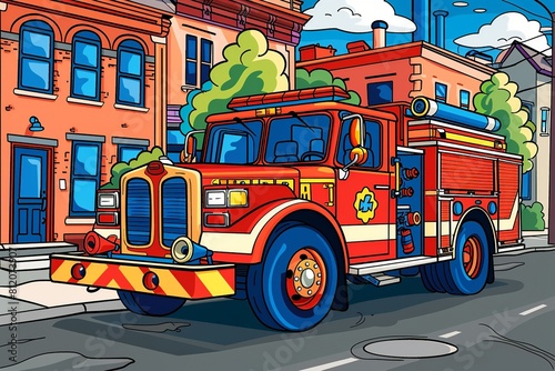 © Roberto, Fototapeta premium This vibrant illustration showcases a modern fire rescue vehicle fully equipped, rushing through a city to respond to an emergency, ideal for children's coloring.