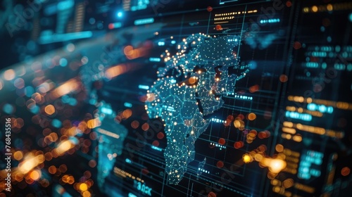 © Intelligent Horizons, Obraz premium This visually striking image depicts a complex,interconnected digital landscape that symbolizes the global economy and its dynamics Vibrant data points,lines,and shapes converge to create a striking