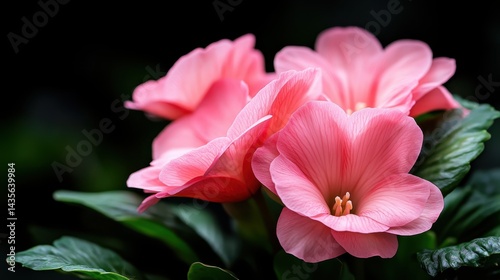 Naklejka premium This vivid image showcases a cluster of delicate pink flowers against a dark...