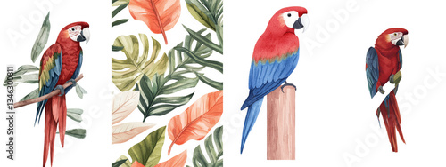 © Zaleman, Fototapeta premium This watercolor illustration is a hand drawing of a beautiful tropical bird, parrot, flowers, and palm leaf, presented on an isolated white background