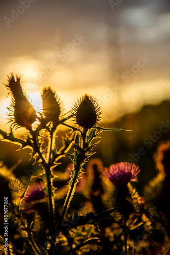© Mareks, Obraz premium Thistles at warm sunset during summer