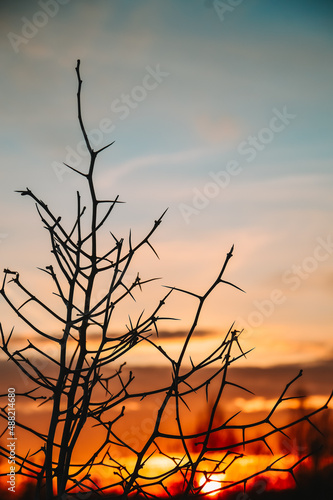 © Ирина Сапроненко, Fototapeta premium Thorny branches of a hawthorn bush on the background of sunset. The beauty of the wild. Romance and tranquility, pleasure and peace. Golden clouds and orange sunset