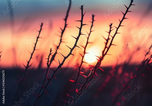 © Photique, Fototapeta premium Thorny branches silhouetted against a vibrant sunset sky.