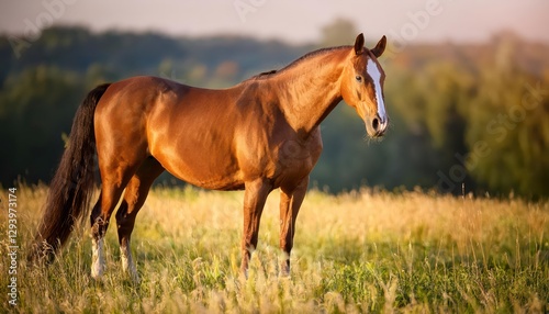 © netsay, Fototapeta premium Thoroughbred Horse Mare Grazing Peacefully in a Lush Pasture at Dawn Serene and Majestic Beauty of Nature Captured, Perfect for Artwork, Home Decor, or Inspiration.