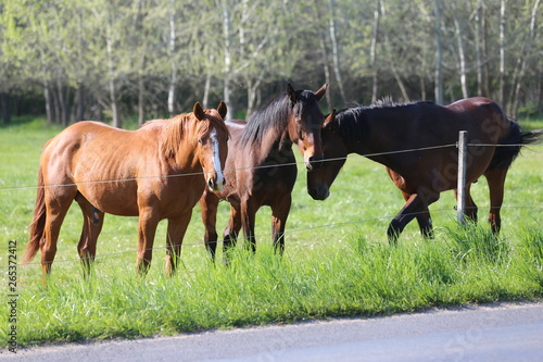 © acceptfoto, Fototapeta premium Thoroughbred horses walking and grazing in green meadow in beautiful morning springtime