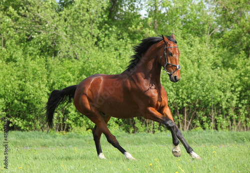 © horsemen, Fototapeta premium Thoroughbred race horse runs gallop in summer meadow