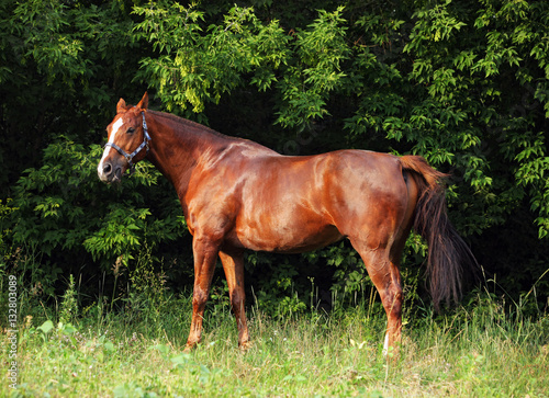 © horsemen, Fototapeta premium Thoroughbred young horse posing against summer woods