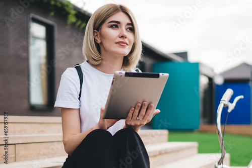 Fototapeta premium Thoughtful adult modern female sitting on stairs with bicycle browsing tablet...