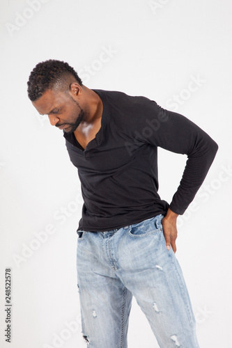 Fototapeta premium Thoughtful Black man in a black shirt and jeans