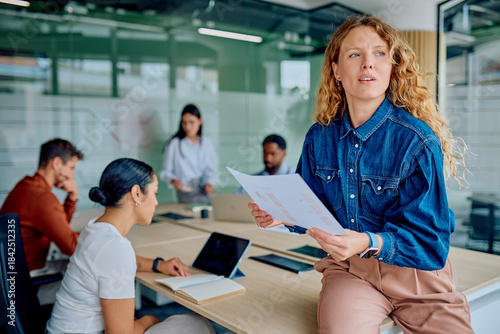 Obraz premium Thoughtful business woman holding charts during a meeting, visualizing future...