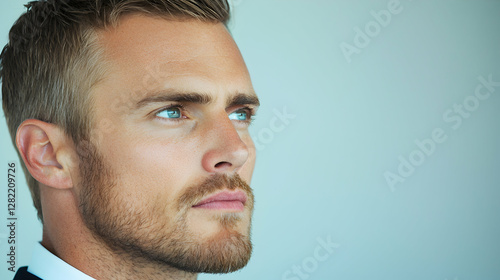 © MAKASIHMAS SIDNEY, Fototapeta premium Thoughtful businessman profile, studio shot, light background, business portrait