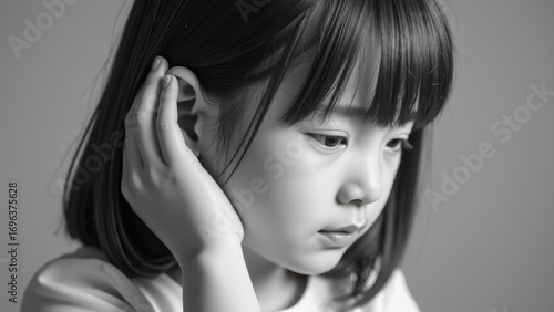 © Napat, Obraz premium Thoughtful child with short hair, gently touching her ear, appears lost in contemplation. monochrome tones enhance emotional depth of moment