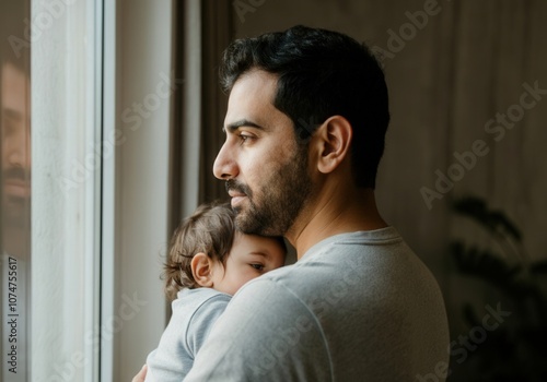 © Running opossum, Fototapeta premium Thoughtful father holding his baby while looking out the window, hoping for a brighter future