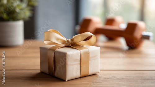 Fototapeta premium Thoughtful gift fitness equipment presented defocused beautifully golden,...