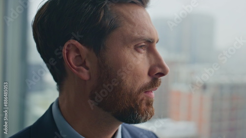 Fototapeta premium Thoughtful man contemplating gloomy cityscape closeup. Smiling boss resting