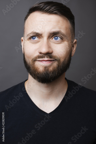 © Strelciuc, Fototapeta premium Thoughtful man smirking and looking up
