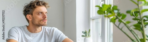Obraz premium Thoughtful man staring out window, passionate introspective emotional look,...