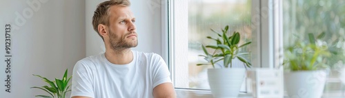 Obraz premium Thoughtful man staring out window, passionate introspective emotional look,...