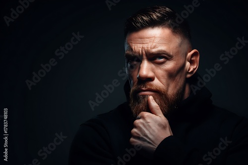 Fototapeta premium Thoughtful man with beard contemplating against dark background