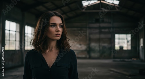 © Jago, Fototapeta premium Thoughtful woman gazing in moody abandoned factory setting