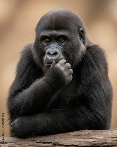 Obraz premium Thoughtful young gorilla with curious expression rests on log, a gentle giant...