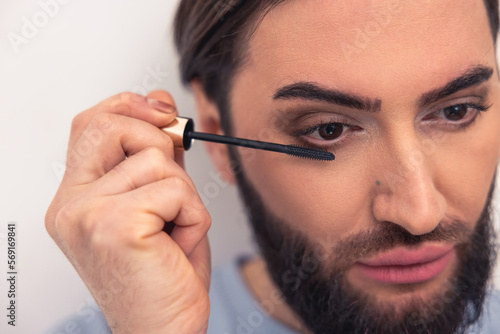 © zinkevych, Obraz premium Thoughtful young man applying the eye makeup