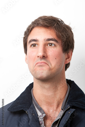 © MDBPIXS, Fototapeta premium Thoughtful young man looking away against white background
