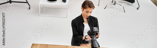 Obraz premium thoughtful young professional female photographer in casual attire holding modern camera, banner