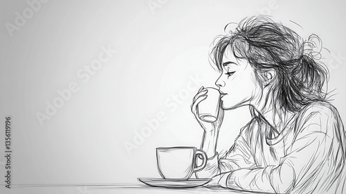 Fototapeta premium Thoughtful Young Woman Enjoying Coffee in Minimalist Style with Pencil Sketch...
