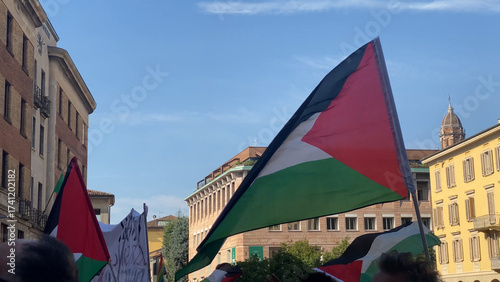 Fototapeta premium Thousands of activists and concerned citizens gathered in Cremona Lombardy Italy holding Palestinian flags and peace banners demonstrating solidarity with Gaza