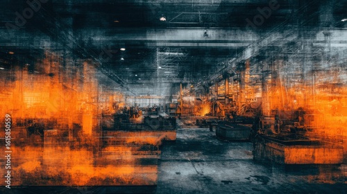 Obraz premium Threatening factory interior with burning welders and alarm beacons