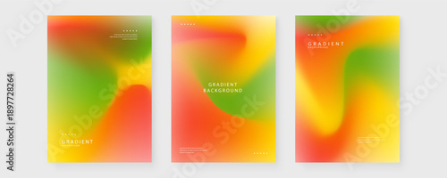 © Badr Warrior, Obraz premium Three abstract posters featuring soft blurred mesh gradients in green orange and yellow colors for minimalist layout design