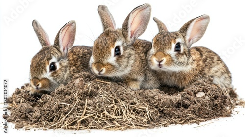 © Napasnan, Fototapeta premium Three Adorable Baby Rabbits Sitting on Pile of Fresh Soil