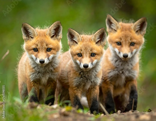 © Declan, Fototapeta premium Three adorable fox kits stand side-by-side, their furry bodies and alert expressions captured in a close-up shot. The background is soft green