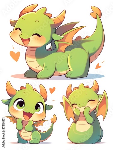 Obraz premium Three adorable green baby dragons with different expressions