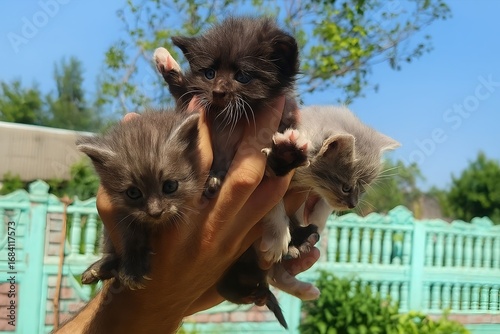 Obraz premium Three adorable kittens being held in a hand outdoors on a sunny day with...
