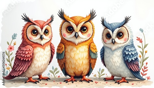 © Rohmah, Fototapeta premium Three Adorable Owls in Pastel Colors