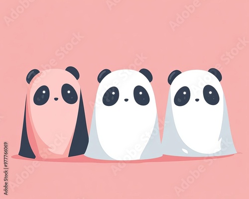 © Lightgeo, Obraz premium Three adorable panda characters, each with unique expressions, set against a soft pink background, perfect for fun designs.