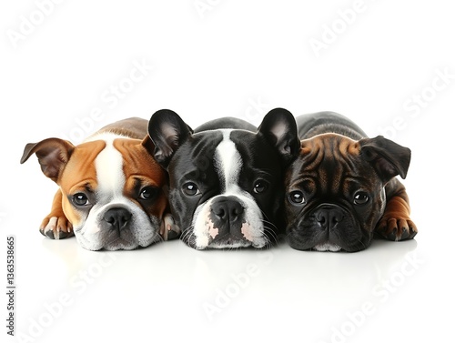 © kona, Obraz premium Three adorable puppies lying down together looking towards the viewer