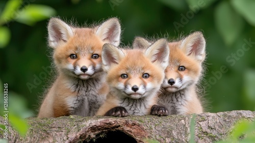 © Bella, Obraz premium Three adorable red fox kits on a tree stump
