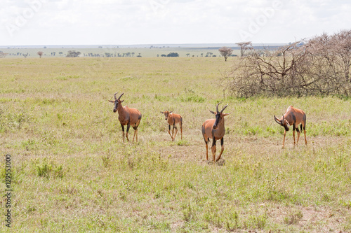 © shujaa_777, Fototapeta premium Three adult and one young Topi antelope stand on savanna plain. Serengeti National Park, Great Rift Valley, Tanzania, Africa.