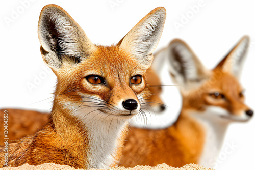 © Arthur Constantine, Obraz premium Three Alert Red Foxes with Bright Eyes Against a White Background