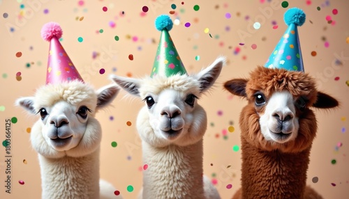 Naklejka premium Three alpacas wear party hats amidst falling confetti. Animals look festive and cheerful, ready for a celebration. Alpacas have fluffy wool and cute faces, appearing playful and happy together.