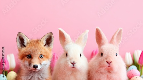 Fototapeta premium Three animals sit together in front of colorful flowers and eggs for spring