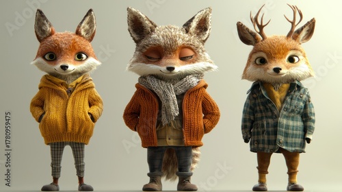 Obraz premium Three anthropomorphic foxes in a cozy, winter setting, wearing knitted...