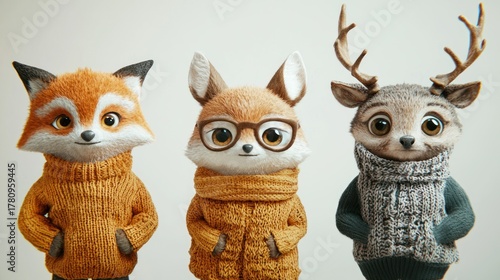 Obraz premium Three anthropomorphic foxes in sweaters with glasses, standing in a row.